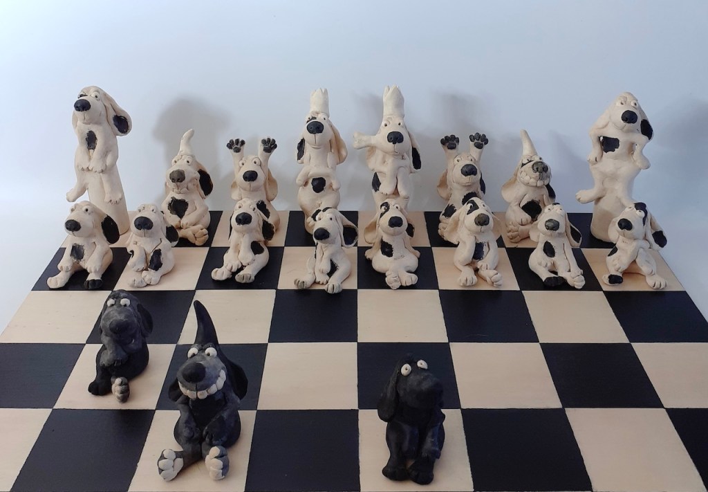 Echiquier « Entre chiens », 2024. Pièces uniques en céramiques, plateau en bois de peuplier peint et verni (56cm/56cm) 2500 euros