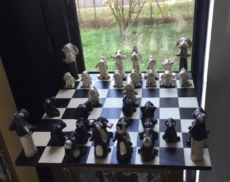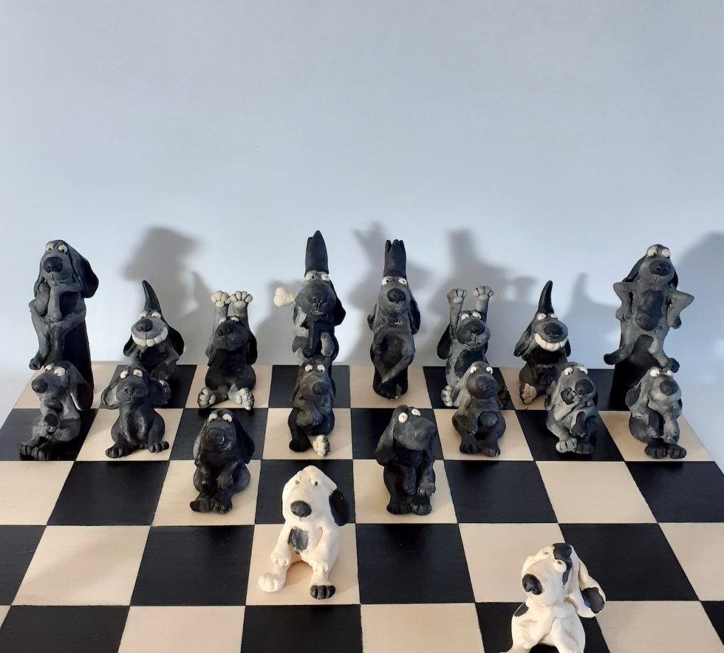 Echiquier « Entre chiens », 2021. Pièces uniques en céramiques raku, sur plateau bois peuplier peint et verni. ( Adopté )