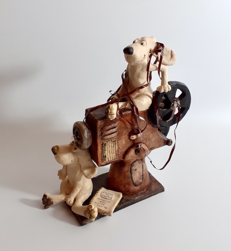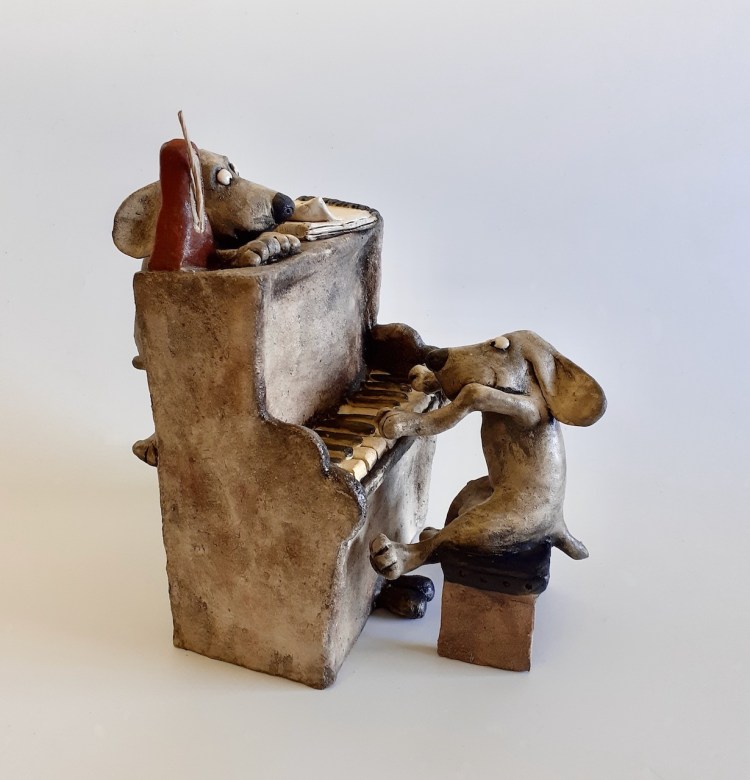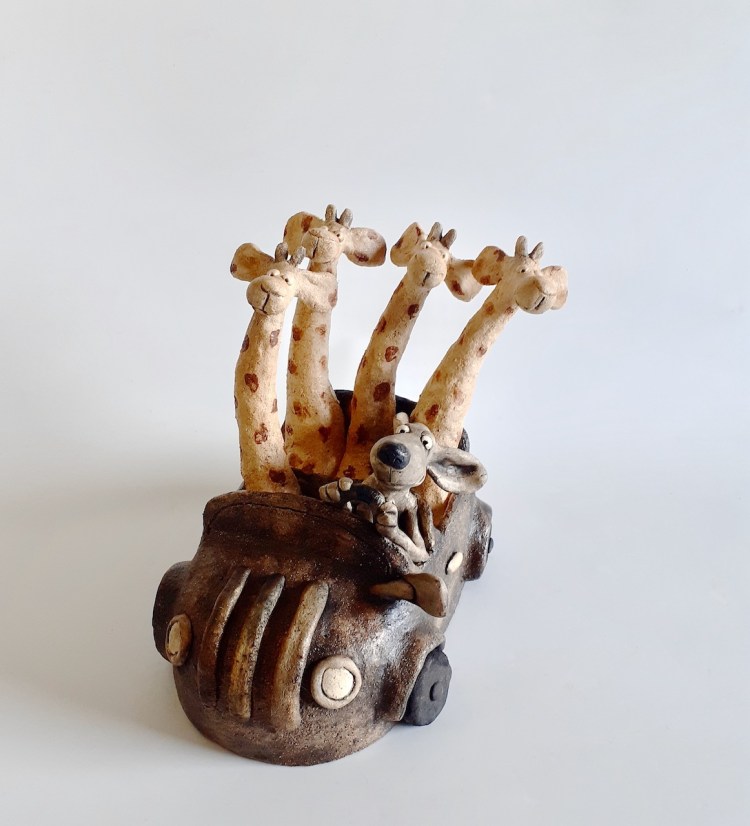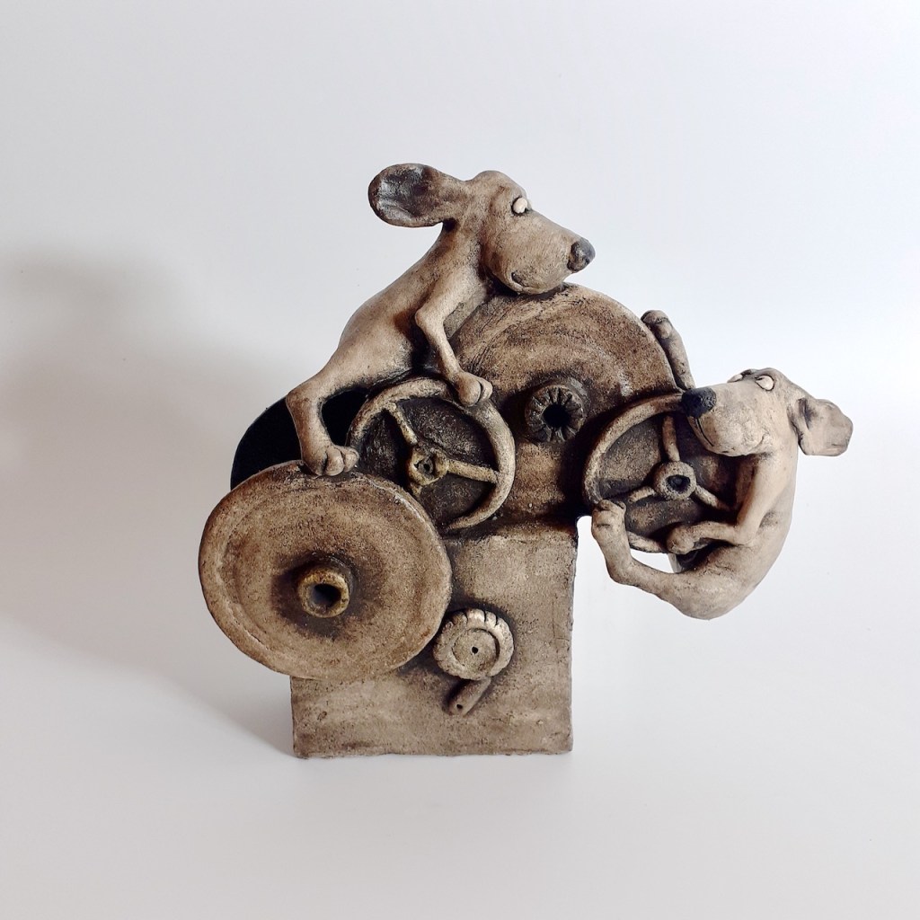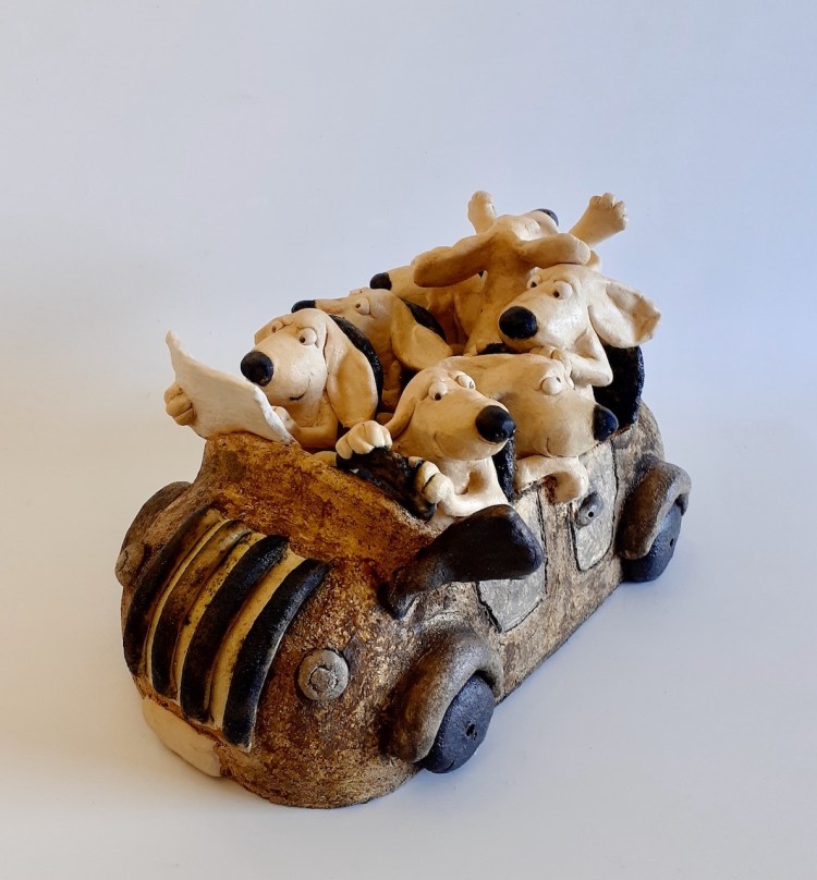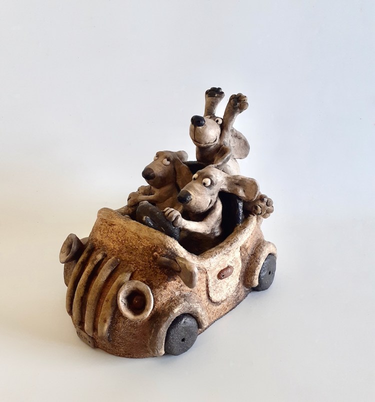 Road trip musical, terre cuite patinée, H 24 cm/ 23cm ( Disponible à laMaison des Artisans, Mennetou/Cher (41)