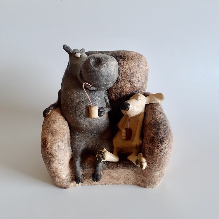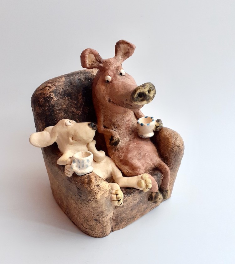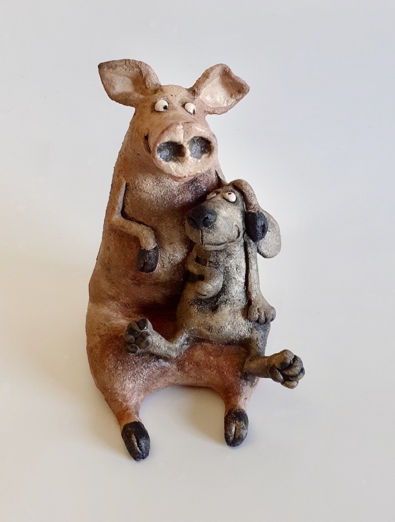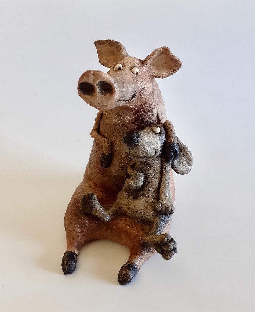 Copains comme cochon, terre cuite patinée, H 19 cm/ 17cm