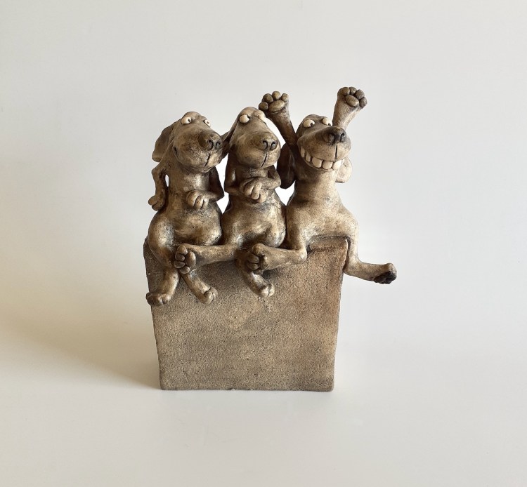Train-train, terres cuites patinées, H 16 cm/15cm. L’ensemble des 3 pièces : 300 euros-